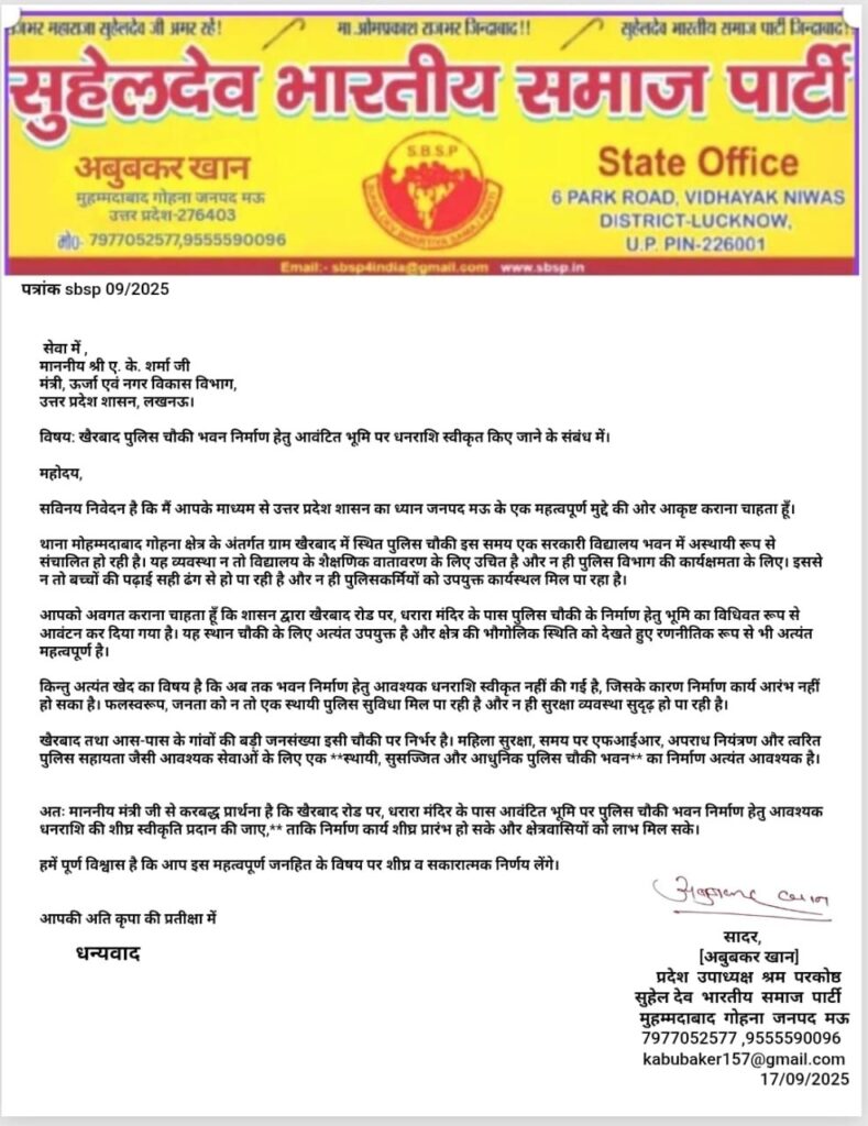 श्री खान ने एक पत्र में कहा कि थाना मोहम्मदाबाद गोहना क्षेत्र के अंतर्गत ग्राम खैरबाद में स्थित पुलिस चौकी इस समय एक सरकारी विद्यालय भवन में अस्थायी रूप से संचालित हो रही है। इस व्यवस्था से न केवल विद्यालय के शैक्षणिक वातावरण पर नकारात्मक असर पड़ रहा है, बल्कि पुलिस विभाग की कार्यक्षमता भी प्रभावित हो रही है।