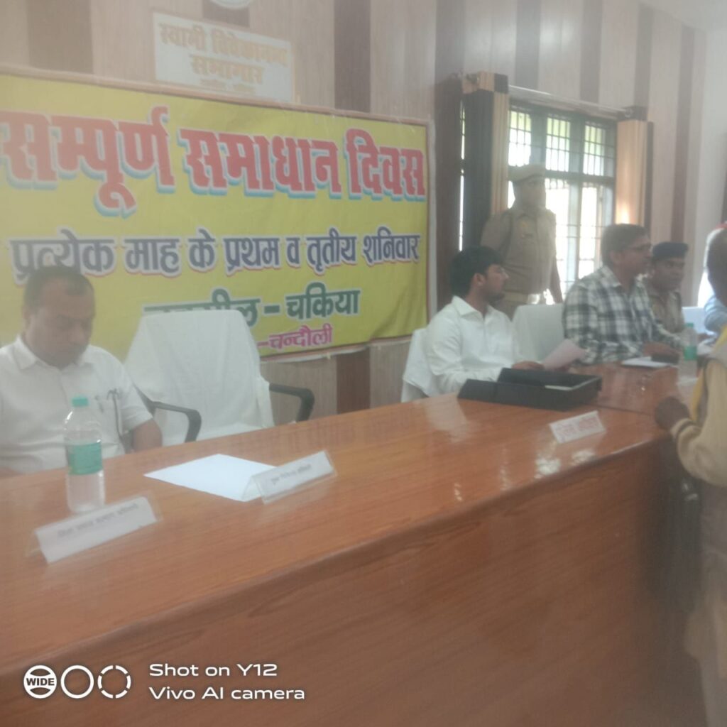 जनपद चंदौली अंतर्गत तहसील चकिया सभागार जिलाधिकारी चंदौली के अध्यक्षता में संपूर्ण समाधान दिवस का आयोजन किया गया जिसके अंतर्गत जनपद के समस्त विभागों के अधिकारी गण उपस्थित होकर जनता की समस्याओं से संबंधित प्रार्थना पत्र प्राप्त कर अविलंब समस्या समाधान करने का भरोसा दिया