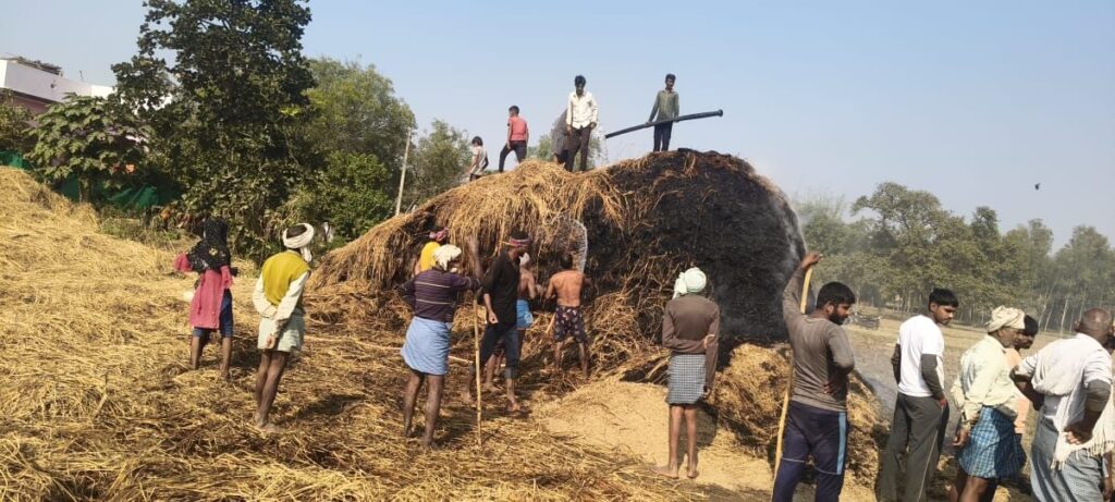 तहसील नौगढ़ क्षेत्र के चुप्पेपुर गांव में दोपहर अचानक लगी आग ने किसान देवेश सिंह यादव के खलिहान में रखे धान के पुआल को भारी नुकसान पहुंचाया। तेज दोपहरी और हवा के कारण आग ने कुछ ही मिनटों में विकराल रूप ले लिया और किसान के लगभग 20 से 25 बीघा खेत का पुआल जलकर राख हो गया। आग कैसे लगी, इसका कारण अब तक स्पष्ट नहीं हो सका है। पुआल में आग की लपटें उठते ही ग्रामीणों ने शोर सुनकर मौके की ओर दौड़ लगाई। देखते ही देखते दर्जनों लोग बाल्टी, डब्बे, पाइप लेकर आग बुझाने में जुट गए। साथ ही खेत के किनारे मौजूद कुएँ पर इंजन मशीन लगाकर लगातार पानी छिड़का जाने लगा। तेज हवा के कारण आग कई दिशाओं में फैलने की कोशिश कर रही थी, लेकिन ग्रामीणों ने जोखिम उठाकर आग को रोकने का प्रयास किया।