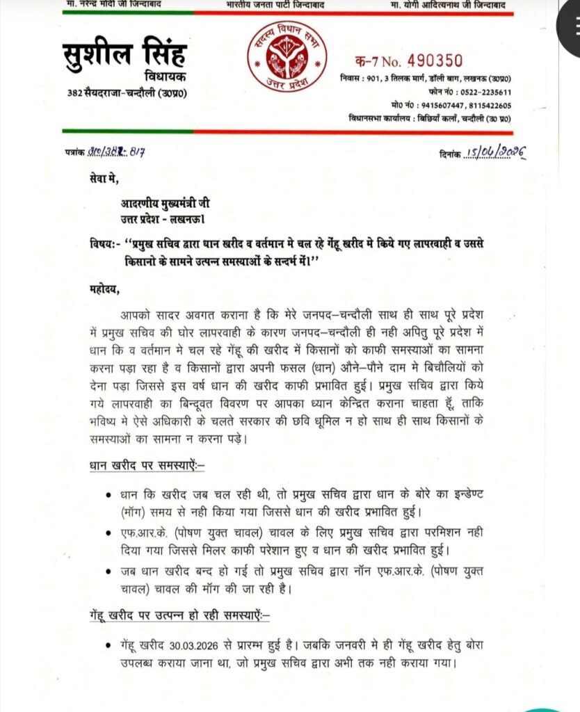 चंदौली। सैयदराजा विधायक सुशील सिंह ने जिले के किसानों की समस्याओं को लेकर मुख्यमंत्री योगी आदित्यनाथ को पत्र लिखा है। विधायक ने पत्र में मुख्यमंत्री का ध्यान भी इस ओर खींचा है।