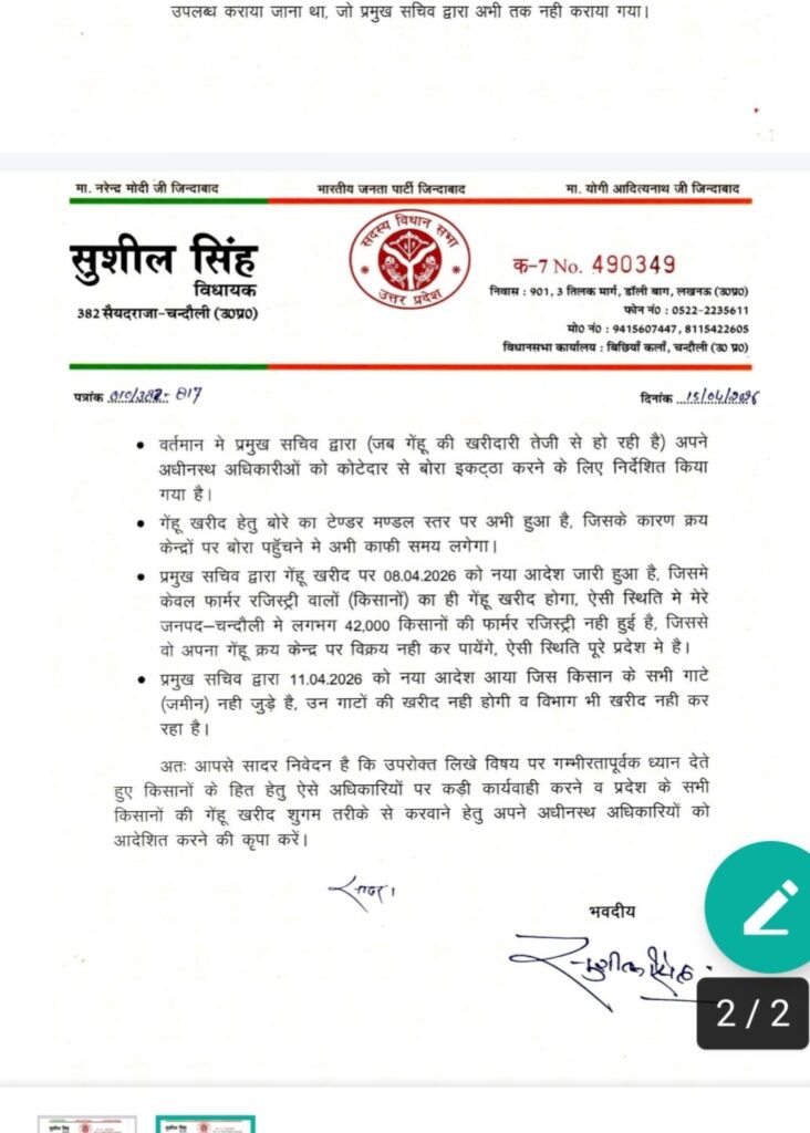 पत्र में विधायक सुशील सिंह ने चंदौली जनपद के किसानों के हित में कई अन्य मुद्दे भी उठाए हैं। उन्होंने कहा कि किसान प्रदेश की रीढ़ हैं और उनकी हर समस्या का समय पर समाधान होना चाहिए। फार्मर रजिस्ट्रेशन पूरा होने से किसानों को पीएम किसान सम्मान निधि, फसल बीमा और अन्य योजनाओं का लाभ सीधे मिल सकेगा।