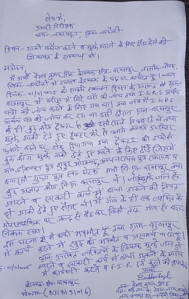 बरबसपुर गांव के हल्का लेखपाल वैभव सिंह बारिश में गिरे कच्चे घरों और IGRS पोर्टल पर दर्ज शिकायतों की जांच के लिए पहुंचे थे। सत्यापन के दौरान कुछ लोग ट्रैक्टर-ट्रॉली से उतरकर आए और लेखपाल से बहस शुरू कर दी। विवाद बढ़ा तो उन लोगों ने गाली-गलौज करते हुए लेखपाल को दौड़ा लिया और जान से मारने की धमकी दी। घबराए लेखपाल ने गांव के ही एक व्यक्ति की मोटरसाइकिल से किसी तरह अपनी जान बचाई।