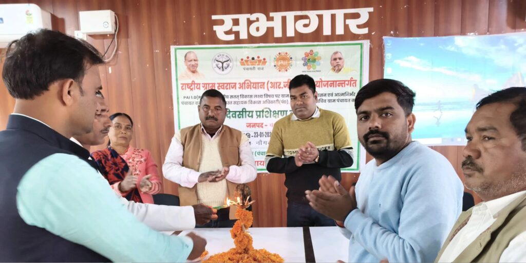 ग्रामीण विकास को नई गति देने एवं ग्राम पंचायतों को अधिक सक्षम, पारदर्शी और परिणामोन्मुखी बनाने के उद्देश्य से आज दिनांक 23 जनवरी को विकास खंड के सभागार में एक दिवसीय विशेष प्रशिक्षण कार्यक्रम का भव्य आयोजन किया गया। यह कार्यक्रम उपनिदेशक (पंचायत), वाराणसी मंडल, वाराणसी के कुशल मार्गदर्शन में संपन्न हुआ, जिसमें जनपद चंदौली के समस्त ग्राम प्रधानों एवं ग्राम पंचायत सचिवों ने सहभागिता की। कार्यक्रम में सहायक विकास अधिकारी (पंचायत) उपेन्द्र कुमार साहनी की गरिमामयी उपस्थिति रही। प्रशिक्षण कार्यक्रम का शुभारंभ माँ सरस्वती की प्रतिमा पर पुष्प अर्पण एवं दीप प्रज्वलन के साथ हुआ, जिससे संपूर्ण वातावरण ज्ञान, अनुशासन और सकारात्मक ऊर्जा से ओतप्रोत हो उठा।
